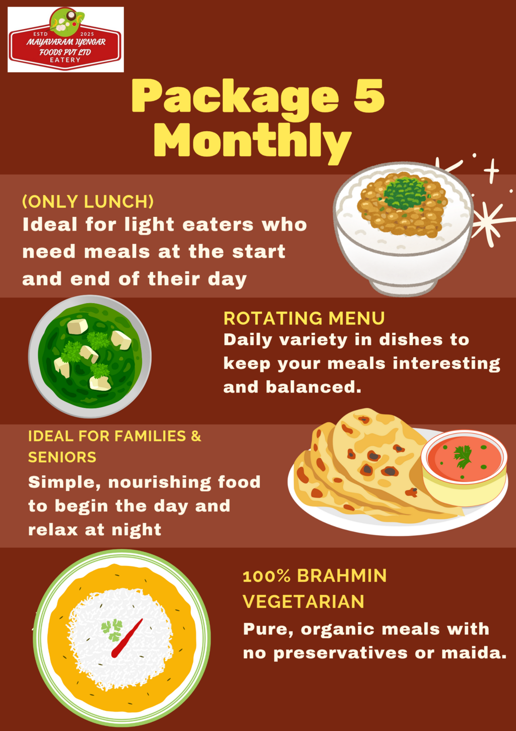 At the end of the day, food is fuel. With our service, you get the fuel your body needs — clean, Brahmin vegetarian, home-style food — delivered fresh, on time, and with integrity. That’s what makes Mayavaram Iyengar Foods Pvt Ltd a name you can count on, every single day.