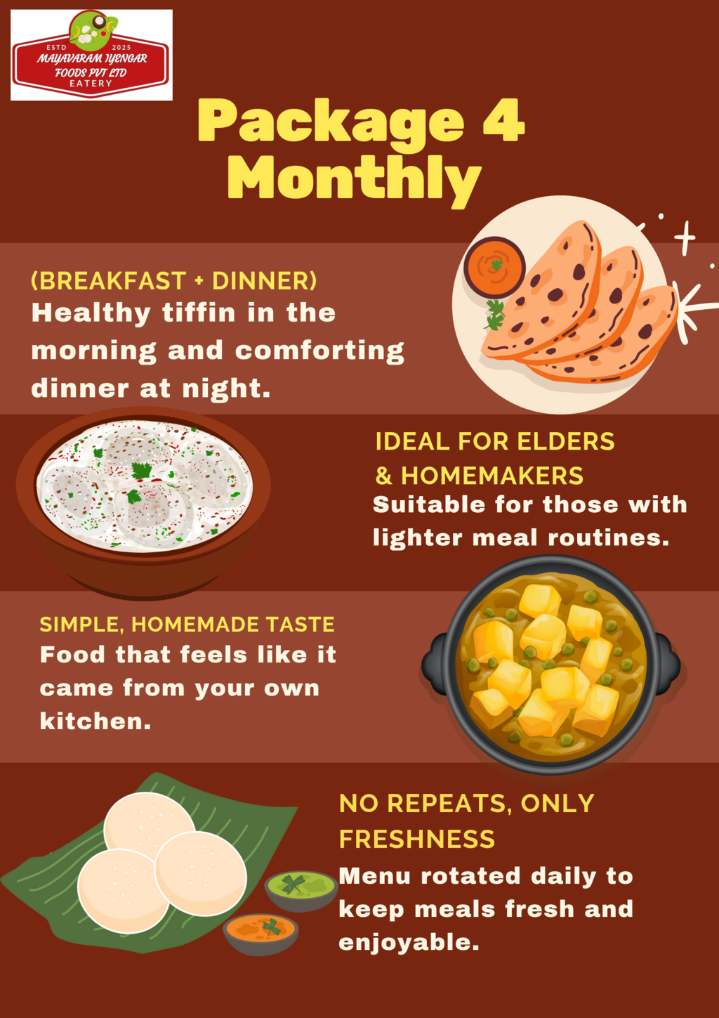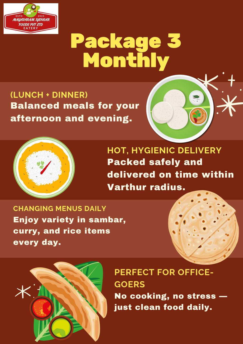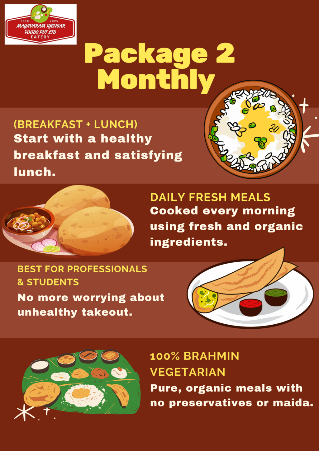At the end of the day, food is fuel. With our service, you get the fuel your body needs — clean, Brahmin vegetarian, home-style food — delivered fresh, on time, and with integrity. That’s what makes Mayavaram Iyengar Foods Pvt Ltd a name you can count on, every single day.